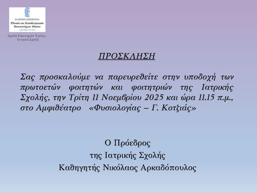 ΠΡΟΣΚΛΗΣΗ ΥΠΟΔΟΧΗΣ ΠΡΩΤΟΕΤΩΝ ΦΟΙΤΗΤΩΝ ΤΡΙΤΗ 11.11.2025